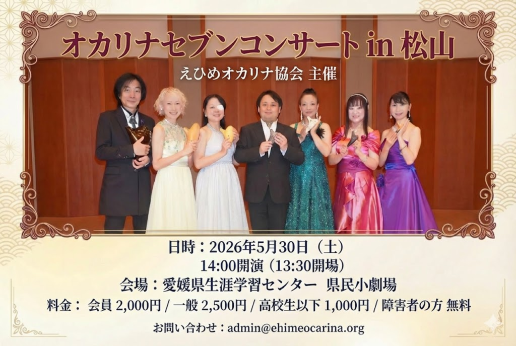 えひめオカリナ協会 主催 オカリナセブンコンサートin松山 出演:オカリナセブン 2026年5月30日(土) 開演時間 14:00 開演 (13:30 開場) 会場 愛媛県生涯学習センター 県民小劇場 料金案内 会員 2 …